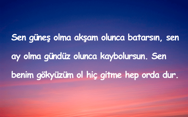 Sen benim gökyüzüm ol, kafamı kaldırdığım her an sana bakayım, elimi uzattığım her an seni tutayım sen benim gökyüzüm ol ben hep senin altında uyuyayım.